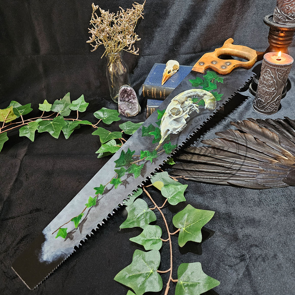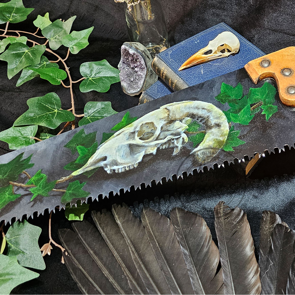 A sheep skull rests along the blade of the saw, entwined with trailing ivy. The skull itself was discovered by a friend, while the ivy was gathered from the artist’s own garden, bringing together elements of landscape and memory.