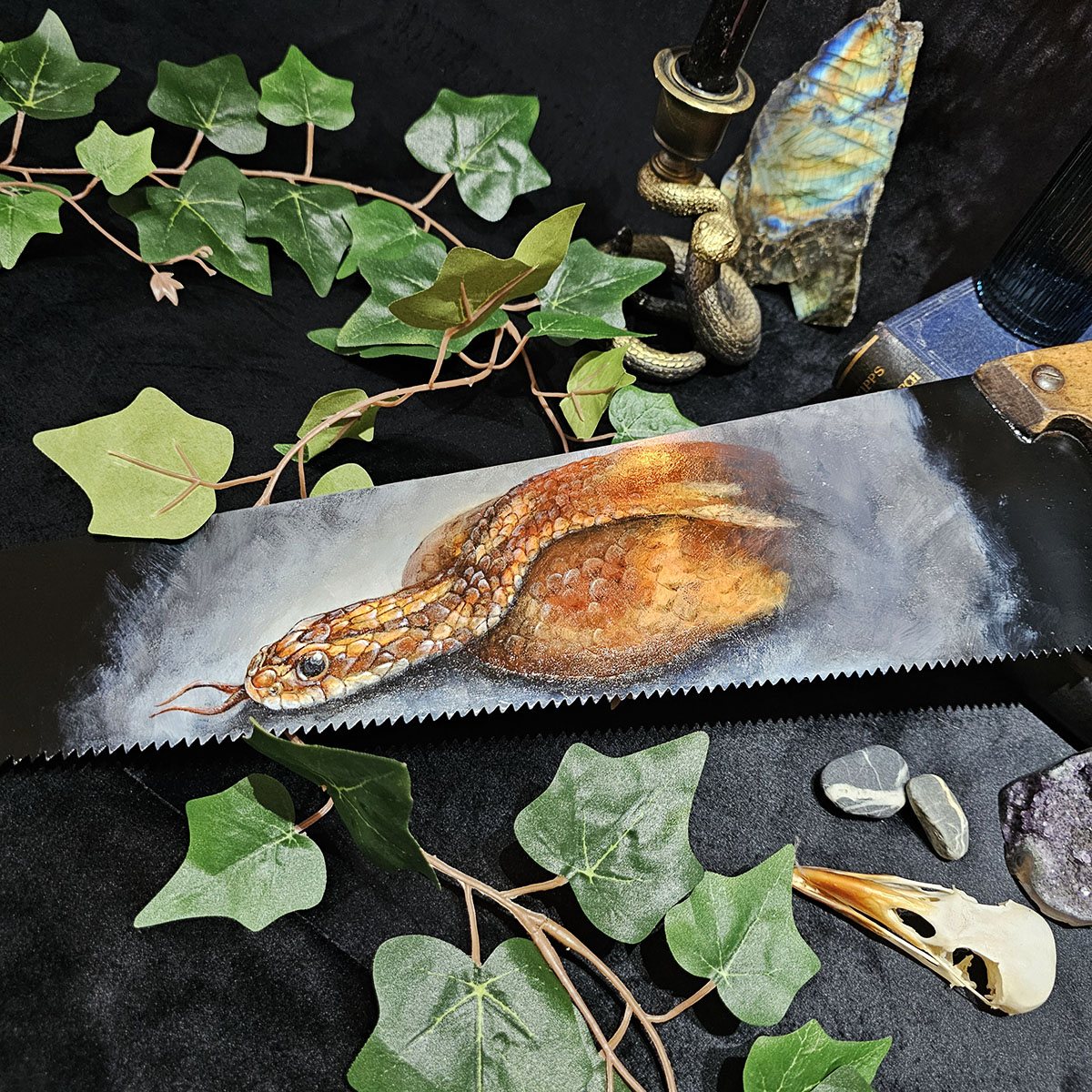 The Tool Rests, the Snake Remains is a one-of-a-kind Original painting on a reclaimed antique hand saw by UK wildlife and nature artist Liisa Clark.
