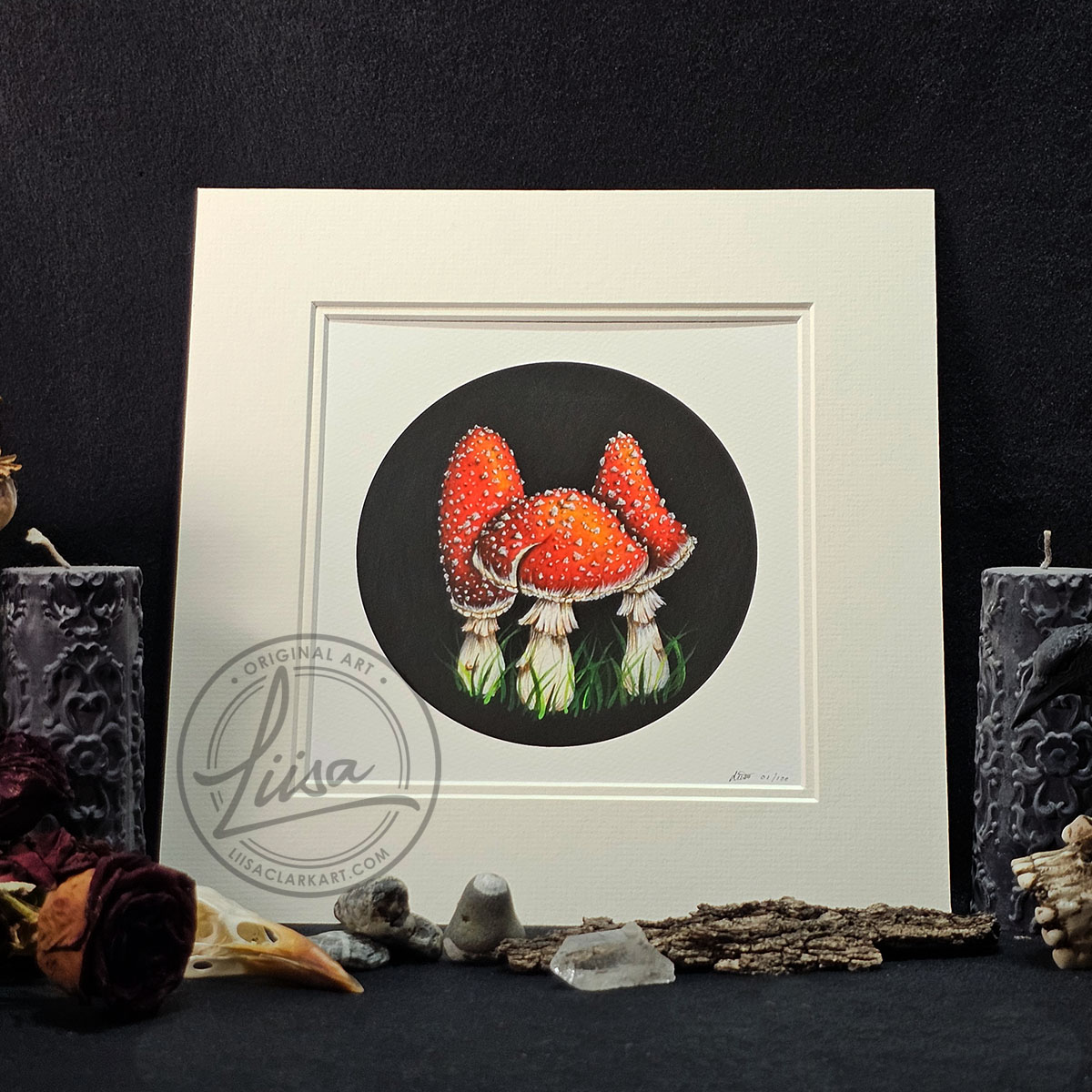 A Beautiful and Enchanting interpretation of 3 cute Fly Agaric or Aminata Muscaria Toadstools. Originally Painted in Acrylic paint on a Circular Canvas Panel and has been recreated in Somerset Velvet Art papers allowing for the Highest Quality Print possible.